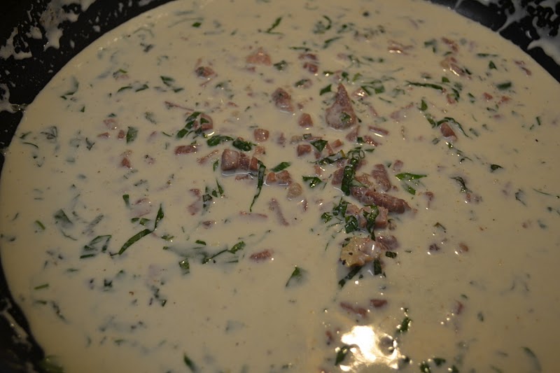 While pasta is cooking, combine cream, Parmesan, prosciutto, wine, eggs, sage, basil, garlic, pepper, salt and nutmeg together, then pour over hot pasta and toss to combine.